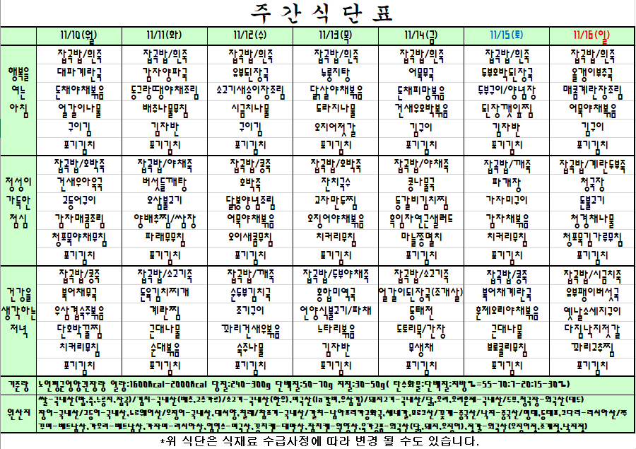 | 2025.11.10~2025.11.16 주간식단표 관리자2025-11-04조회수 390 |