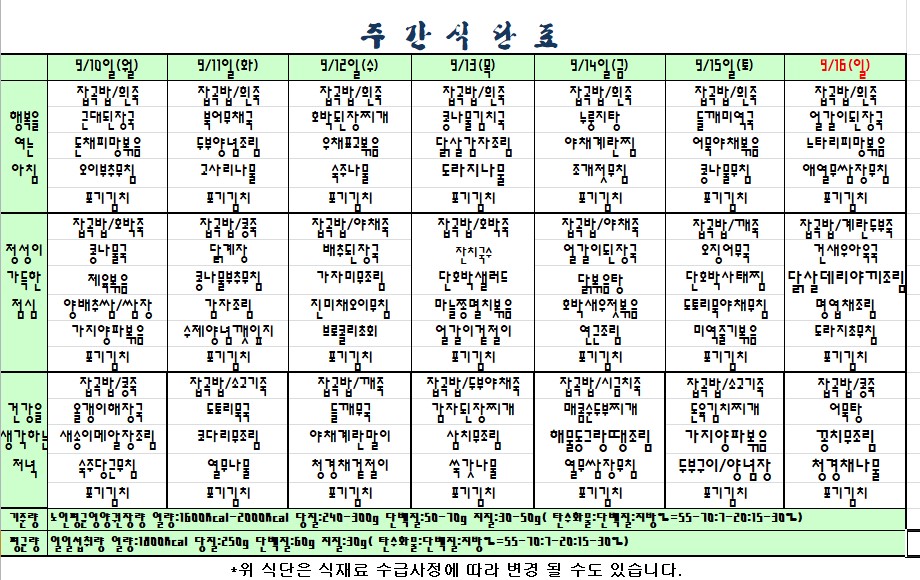 2018.09.10.~09.16. 식단표 |