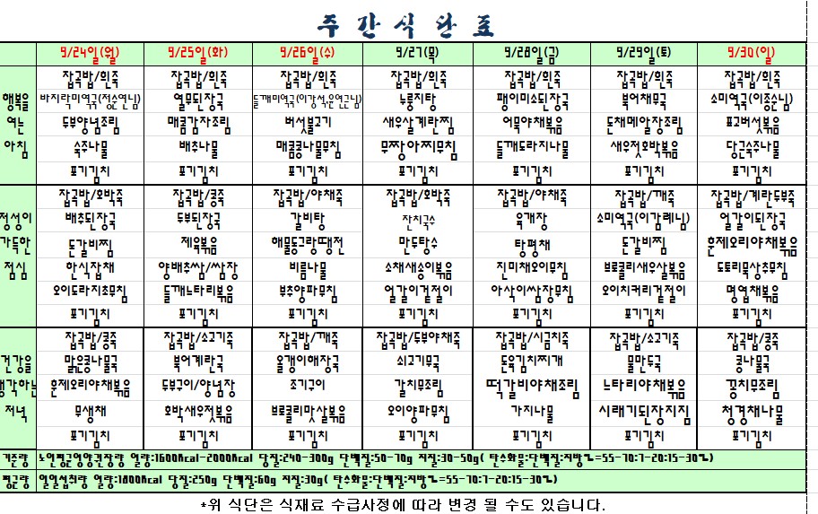 2018.09.24.~09.30. 식단표 |