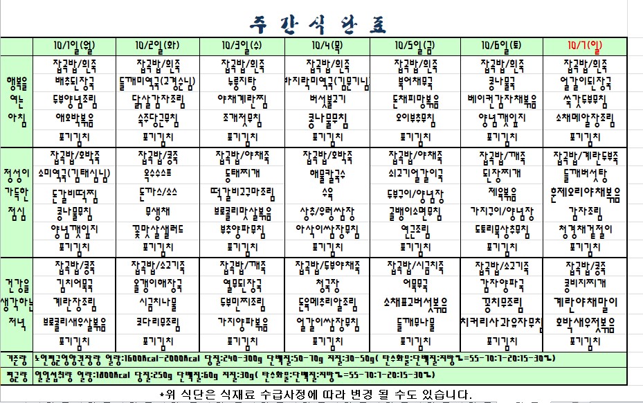 2018.10.01.~10.07. 식단표 |