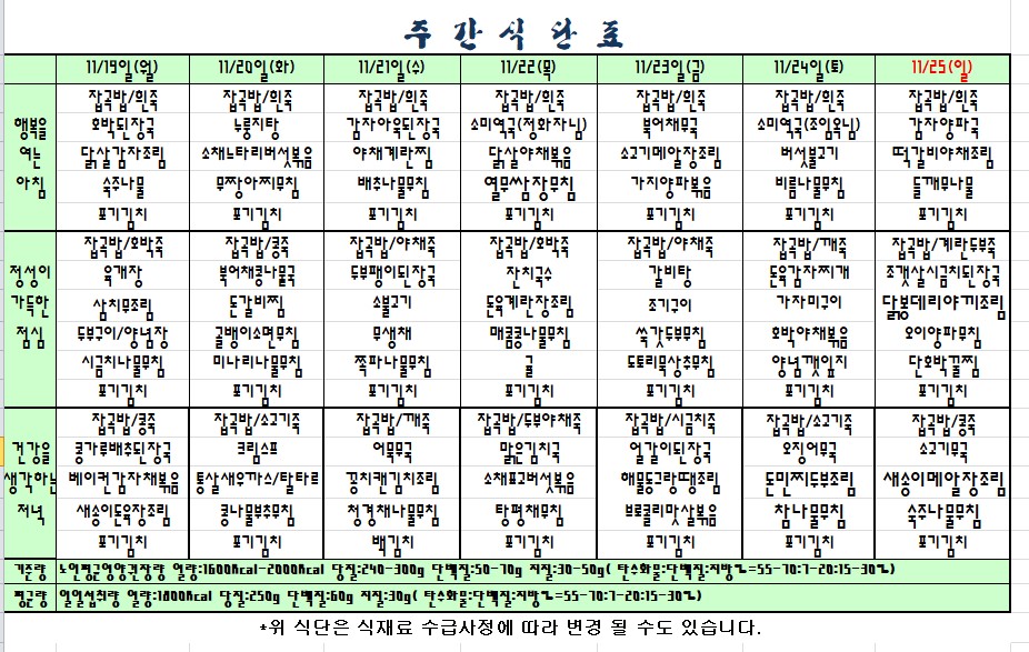 2018.11.19.~11.25. 식단표 |