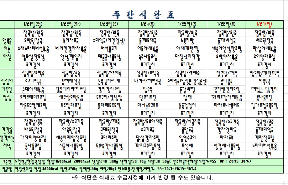 | 2019.01.21.~01.27. 식단표 관리자2019-01-21조회수 3624 |