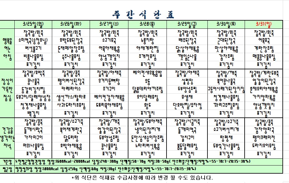 2019.03.25~03.31. 식단표 |